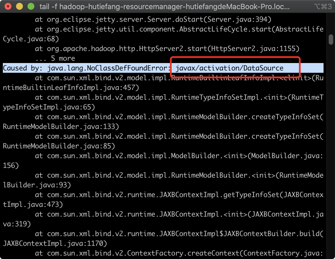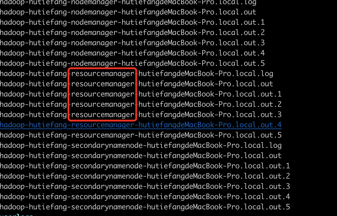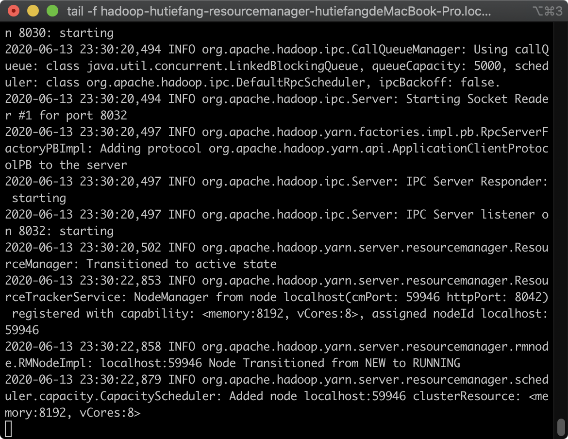 tail -f hadoop-hutiefang-resourcemanager-hutiefangdeMacBook-Pro.local.log