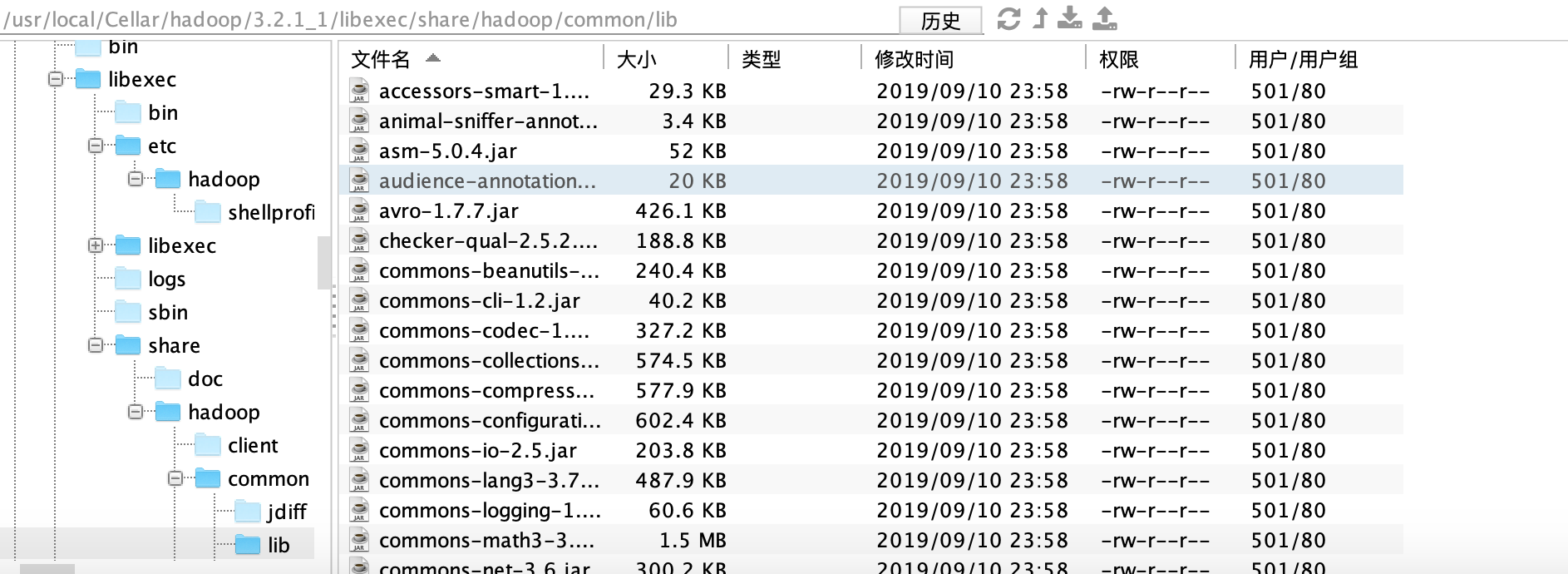cd /usr/local/Cellar/hadoop/3.2.1_1/libexec/share/hadoop/common/lib