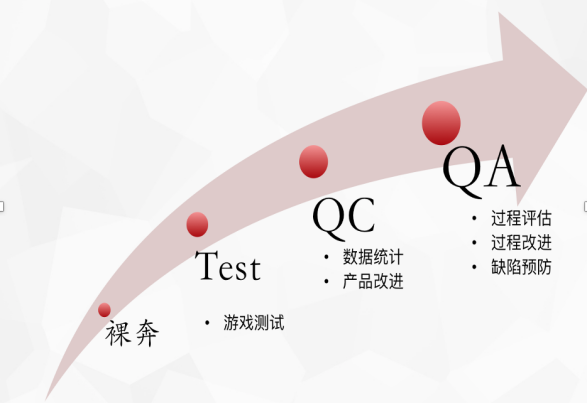 2、中级阶段(QC):质量控制,事中控制——类似“警察”的⻆⾊,不光是发现问题,⽽且要对整个⽣产过程进⾏监督。找到并记录容易出现问题的操作,进行规范改进,促使整体质量提升。代表:⽹易、腾讯的质量保障⼯程师。