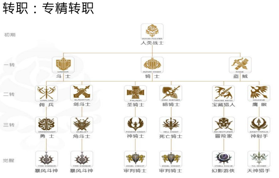 我们玩的游戏,常常会有转职/专精/天赋这类设计,在游戏公司的岗位上也有类似。⽐如作为⼀名策划⼊职后,在经过⼀段时间的学习和接触,可以选择专精成:数值策划、⽂案策划、动作策划。