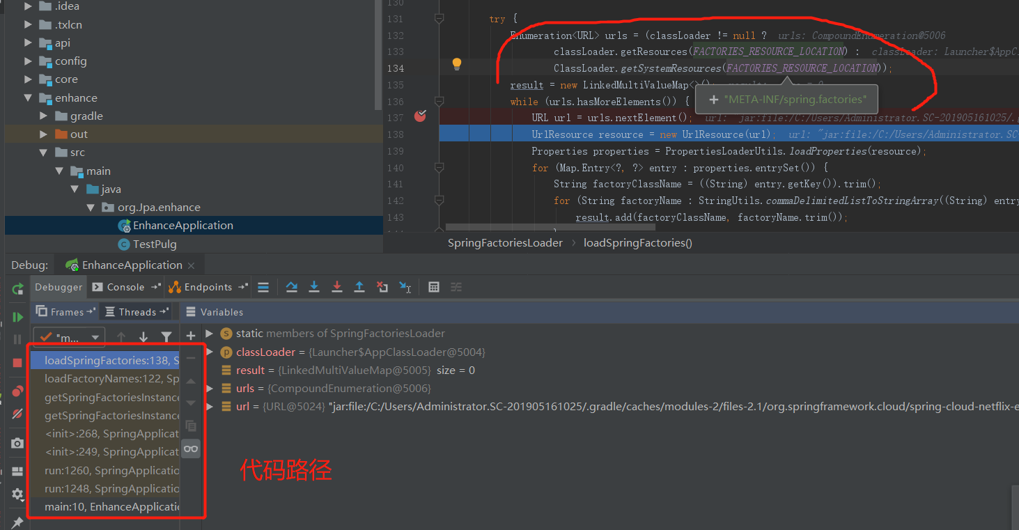 SpirngBoot 启动的时候会去扫码Jar包里面的META-INF/spring.factories文件,如下图