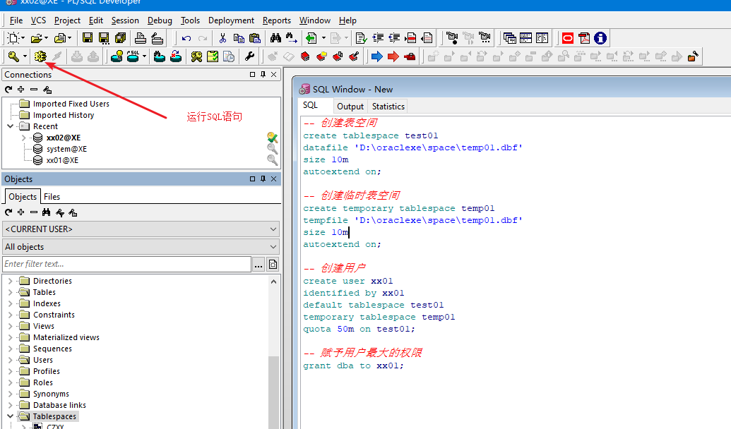 - quota:在哪个表空间上为当前的用户分配多大的大小