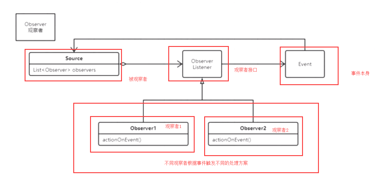 1.事件源对象(被观察者Source)>2.观察者接口(Observer)>3.监听类(观察者1,2,3)>4.事件类(Event事件本身)