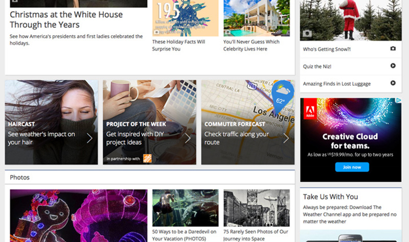 进一步,看看与站内内容相似的线上广告。许多网站开始向广告投放需求方提供与网站整体更加和谐的“赞助”推荐位,以此帮助广告商家获得用户关注。通常网站会出售与网站内容样式相似的推荐位,如上图天气频道投放的Adobe Creative Cloud广告。