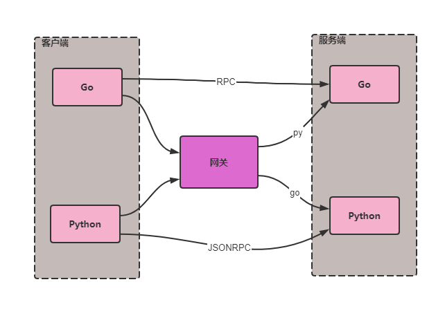 如图所示,相同语言的调用是直接走RPC的, 不同语言的调用是通过网关来统一调用,一般跨语言的服务调用都是用目前访问量不太大的应用来做,多了一次http的转发,性能会比直接调用差一些。其中直接调用的话go的采用msgpack(可定制,默认支持4种)作为默认的解编码工具,ptyhon是用json,所以性能方面go肯定比py要快,从这个层面来说,但是py胜在快速开发。