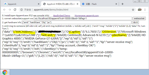 使用浏览器打开demo下的index.html。授权连接后,发送获取PC信息命令。