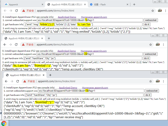 打开demo下的index.html,模拟不同sid打开浏览器。