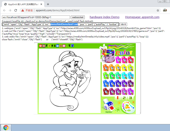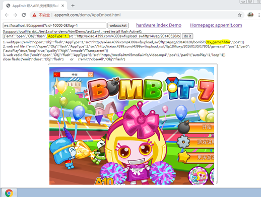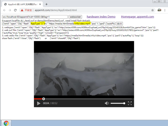 可以是绝对或者相对路径,相对于AppEmit.exe的路径:"demo/htmlDemo/test1.swf"。