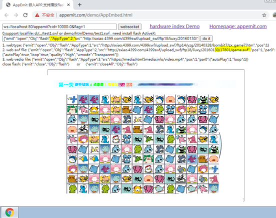 打开demo下的AppEmbed.html,连接授权后,发送使用ActiveX("AppType":0)打开网络flash文件命令,参数如下。