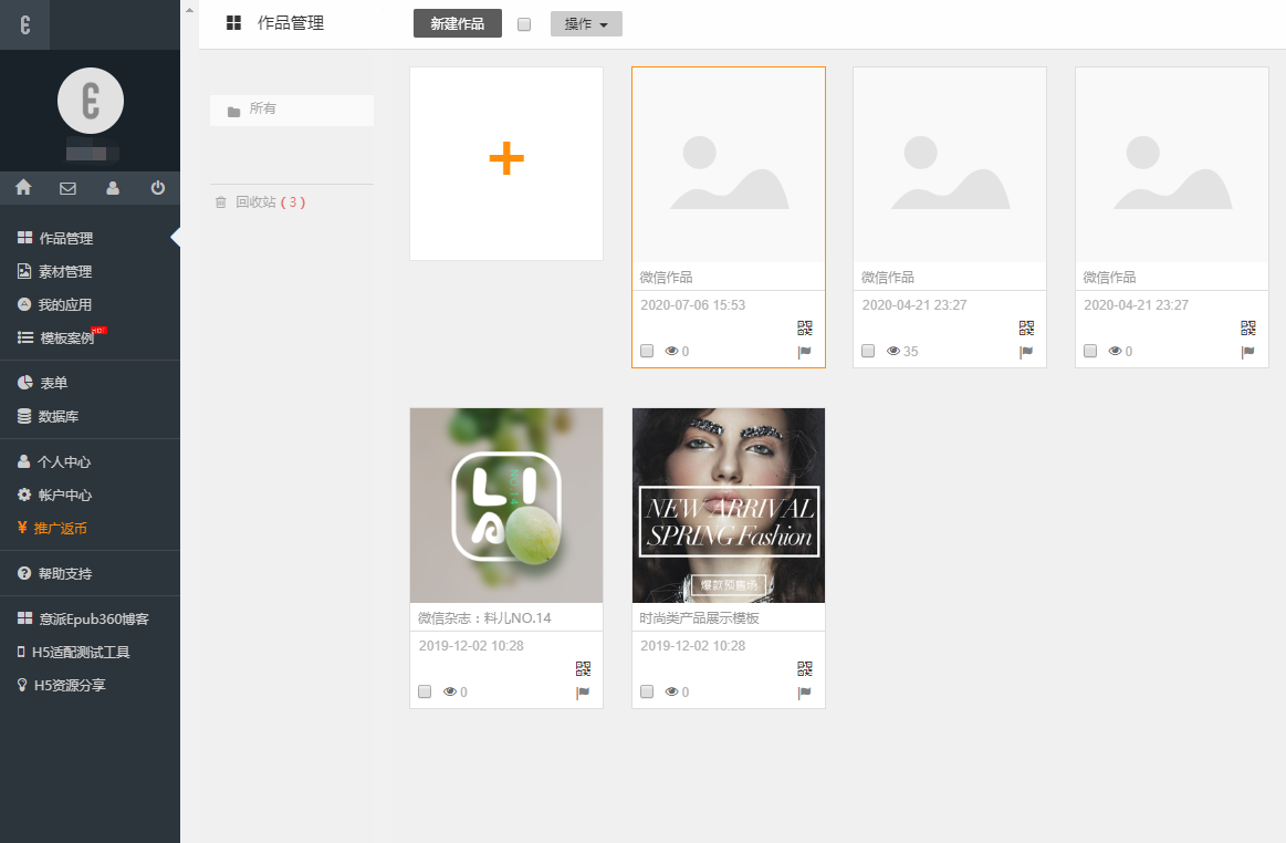 ①登录意派Epub360官网并进入“我的工作台”,点击“+”号新建H5作品。
