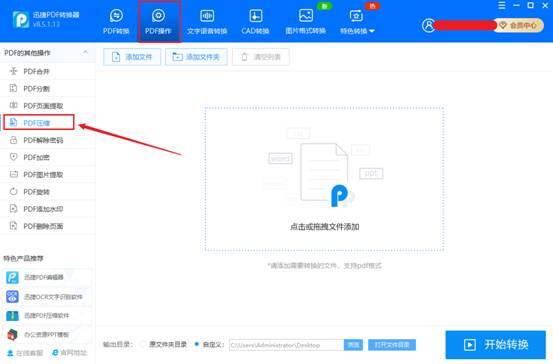 打开迅捷PDF转换器,在软件顶部找到PDF操作,然后在左侧的PDF的其他操作中,点击“PDF压缩。”
