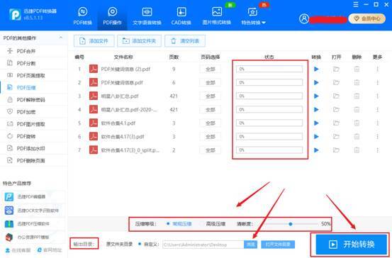 导入完成之后,对PDF的压缩等级和清晰度进行选择,软件默认的是常规压缩和清晰度降低50%,根据需要在此基础上进行调整就可以了,调整完毕之后点击输出目录中的“浏览,”将PDF文件保存到电脑中的其他位置,避免和原文件弄混。