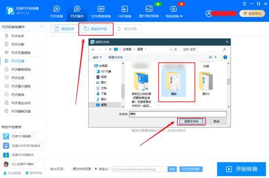 因为需要进行的是批量压缩,所以我们选择“添加文件夹,”选中包含PDF的文件夹进行导入,如果文件夹中有其他的图片、文档也不用担心,迅捷PDF转换器会自动过滤掉无效文件。