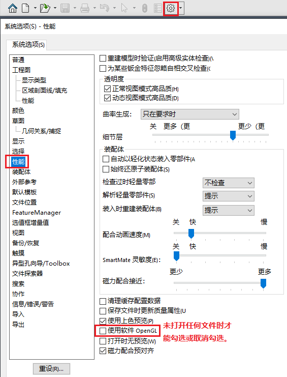 我推测是我所用的Solidworks 2018不支持过新的AMD显卡驱动(Radeon Software Adrenalin 2020 Edition 20.4.2)。另外,在系统选项的“性能”里面,勾选使用软件OpenGL,(此选项只能在没有打开任何文件的时候才能勾选或者取消勾选,勾选后将会由CPU负责显示图形,而不是由GPU显示),异常的片状物就会消失;取消勾选后,异常的片状物又会重新出现。这个现象可以反复重现,也基本能说明是Solidworks版本较低,不支持过新的显卡驱动。CPU毕竟不擅长做GPU的事情,勾选使用软件OpenGL之后,装配体的旋转、缩放、平移、选择面明显变得迟钝,很不好用。CPU只能勉强应付单个零件的显示,负担不起装配体。或许需要更换Solidworks 2020才能彻底解决这个问题。