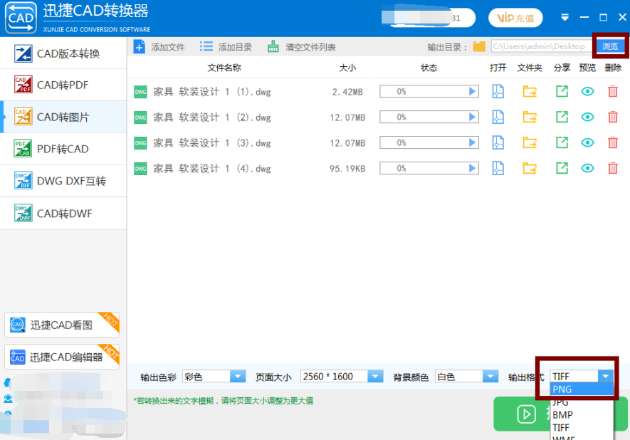 文件添加后,我们点击浏览按钮选项,把文件的保存位置改一改。接着,再在下方的输出格式选项里,点击选择PNG。最后,选择批量转换即可。
