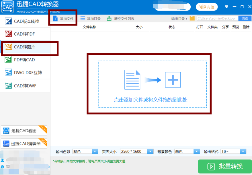 进入迅捷CAD转换器,把软件安装在电脑桌面上。打开运行后,我们在主界面选择CAD转图片功能,随即在右方区域添加相应的文件。