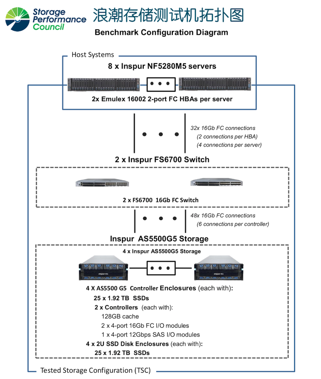 从浪潮存储测试机拓扑图进一步分析来看 ,结合最新公布的SPC-1榜单显示,本次参与测试的浪潮存储AS5500G5,采用4个双控节点、1TB高速缓存、25块1.92TB SSD盘配置,产品整体性能达到330万IOPS,即单控性能达41万IOPS,加上上次登顶SPC-1的浪潮AS5600G2浪潮存储拥有了两件登顶SPC-1的利器,AS5500G5与AS5600G2共同形成了浪潮存储越来越强大的中端存储阵营,在拥有高性能处理能力的同时,可以更好地兼顾企业用户的投资回报。