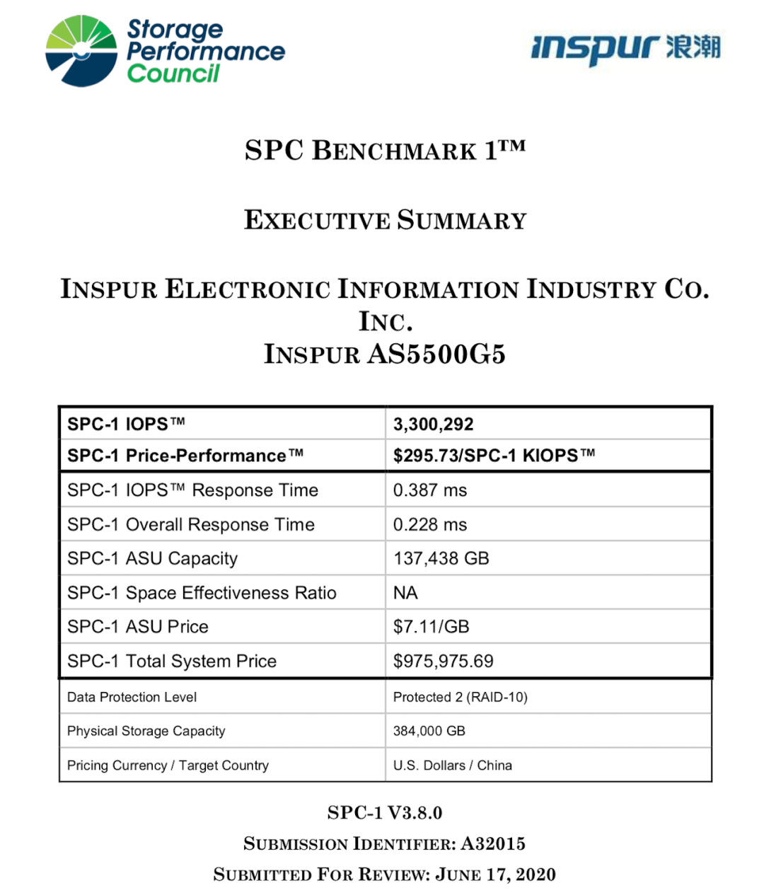 2020年6月22日,全球存储观察从存储性能委员会(Storage Performance Council,SPC)公布的最新SPC-1基准测试报告得知,国内数据存储领域的领先厂商之一,浪潮存储再次登顶SPC-1性能测试。