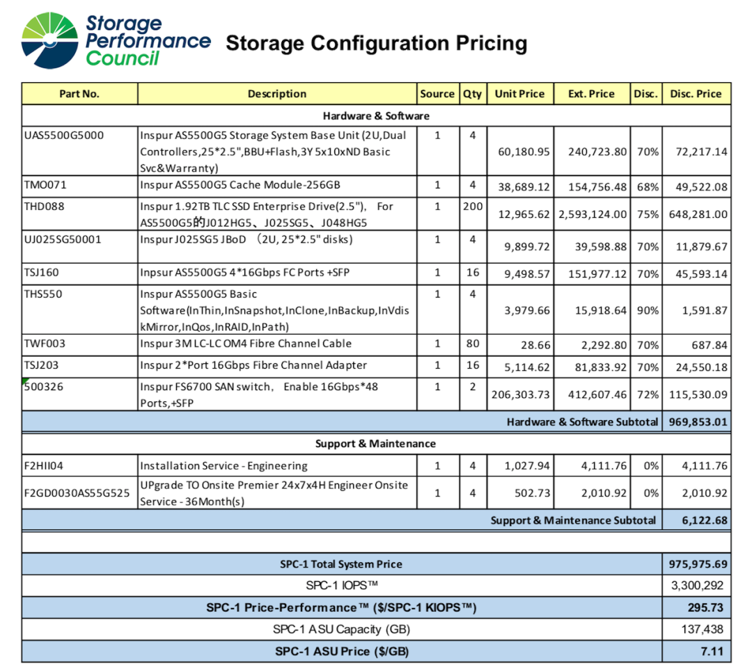 同时,在存储性价比每千IOPS价格成本($/KIOPS)方面,却比后面的第二名、第三名都要低。浪潮存储AS5500G5每千IOPS价格成本为295.73美元,第二名和第三名友商的价格成本分别为481.08美元、445美元,也就是说浪潮8控存储每千IOPS价格成本比后面的第二名、第三名友商的表现低63%和50%。