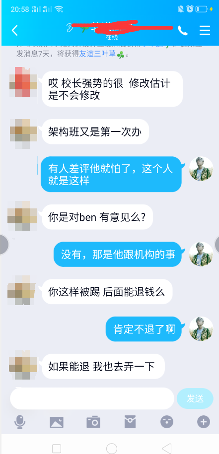 最后呢把机构老板(也叫校长)和本人的所有聊天记录都上传,希望给大家一个明示,挣钱不易,学技术也要选对机构,一些只为钱,没有一点责任和良知的机构千万不要去,浪费了时间金钱不说,还啥也学不到。聊天记录如下: