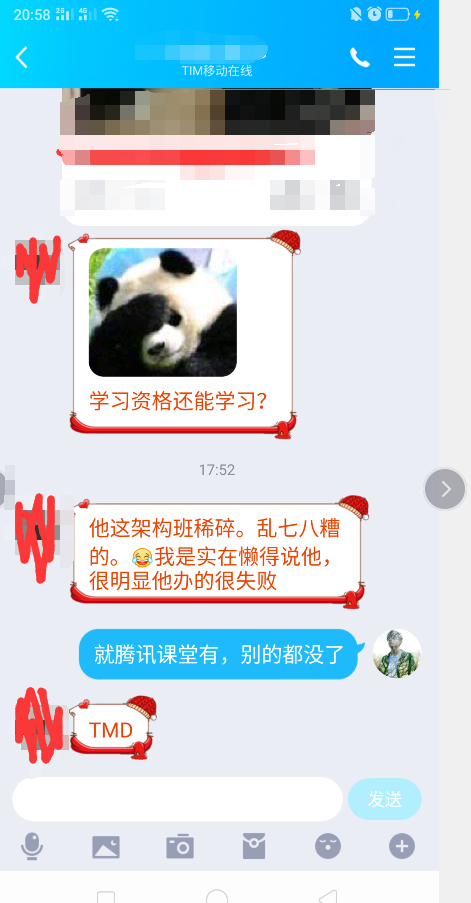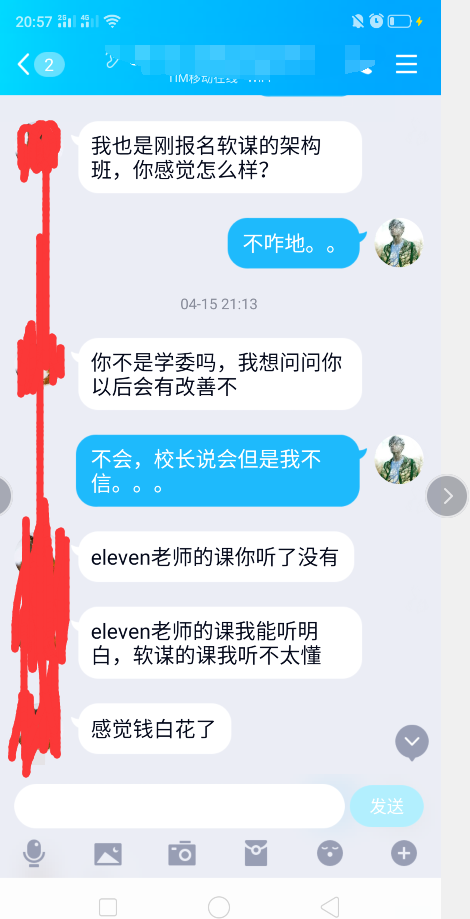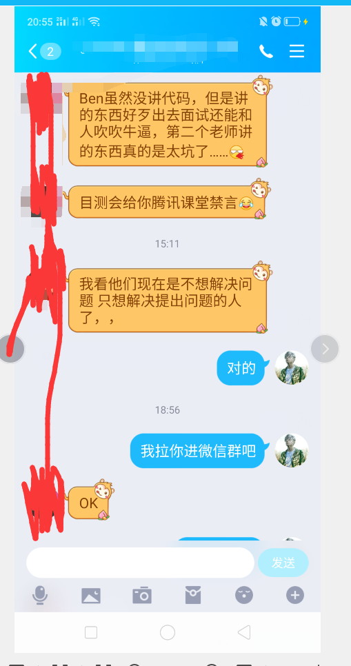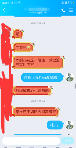 我本人是,net的爱好者,但是很多东西想学习没有途径,官网文档太多了,需要漫长的过程,报班就是为了系统快速学习别人总结好的东西,没想到钱花了,东西没学到,还被机构欺负成这样,希望每一位.neter都能支持我一下,让这种不良机构早日关门,为什么我们就不能有Java那样的环境,让每一位想学东西,想进步的人都有快速学习的通道呢?最后,因为之前我是这个培训机构的这期学员的班委,经常跟同学们聊课程的问题,下面是部分同学的聊天记录,本人所发一切均属实,如有不实愿意承担法律责任。