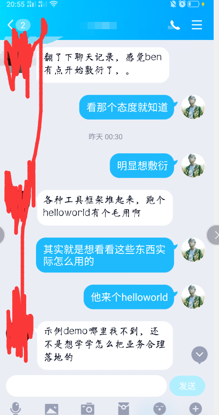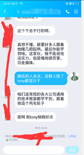 还有一个很有意思的事,就是课表的最后实战,本来是一个高并发抢购项目不知道为什么课表写的好好的,最后机构却直接改了实战项目,变成了一个用了56台机器输出一个hello world的项目,然后,本小白就不服了,去争论了可想而知,被禁言,然后被机构群里开几个号明嘲暗讽。群里截图如下: