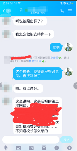 期间我跟机构商量过,希望机构可以改进,但是能创业开公司的人没有一个简单的人啊,机构的老板,也是校长。在我有评价课程权限的时候,一直哄我,骗我修改了评价,后面再提意见,直接禁言,并且禁止群员讨论。