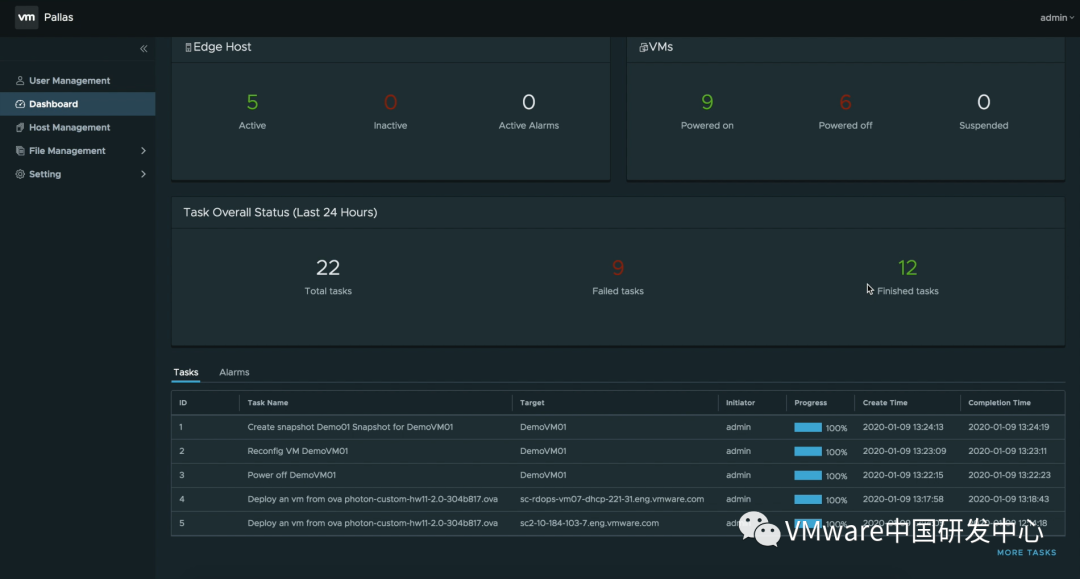需要注意的是:因为管理器和设备之间元数据的传输协议是基于MQTT,所以设备和虚机等状态的更新是异步完成的。如果不能及时看到任务完成,可能需要稍候、或者刷新状态。