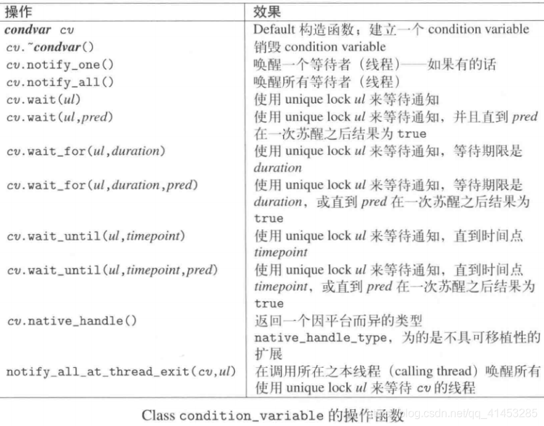 - condition_variable_any提供的操作与condition_variable类似(见上图),但是不提供native_handle()和notify_all_at_thread_exit()