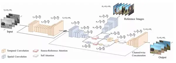 输入一系列的黑白图像,通过预处理网络修复,修复的结果作为最终输出视频的亮度通道。然后,source-reference 网络将预处理网络的输出和任意数目的彩色参考图像结合,产生视频的最终色度通道。