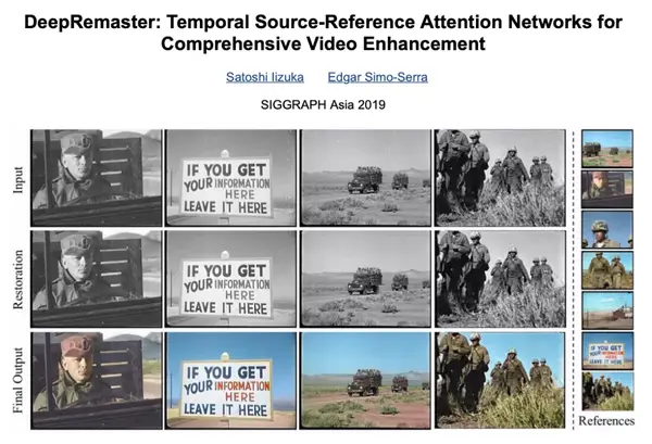 这项技术由日本筑波大学和早稻田大学的两位研究者合作提出,论文被计算机图形学顶会 SIGGRAPH Asia 2019 收录。与近年来使用递归模型处理视频的方法不同,该方法对老旧影像的修复是基于全卷积网络实现的。