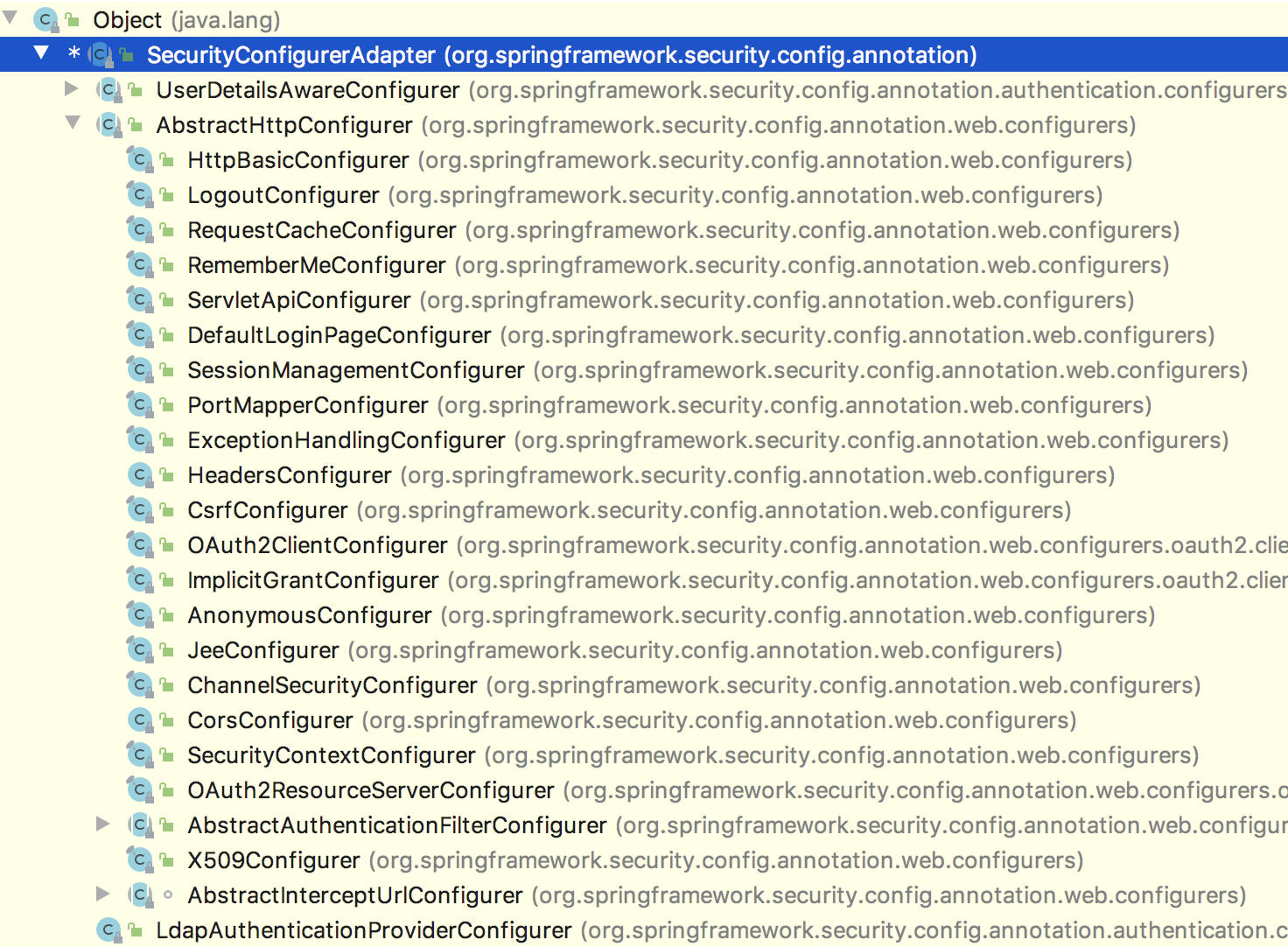Spring Security 框架源码中,随处可见手动装配。Spring Security 中,过滤器链中的所有过滤器都是通过对应的 xxxConfigure 来进行配置的,而所有的 xxxConfigure 都是继承自 SecurityConfigurerAdapter,如下: