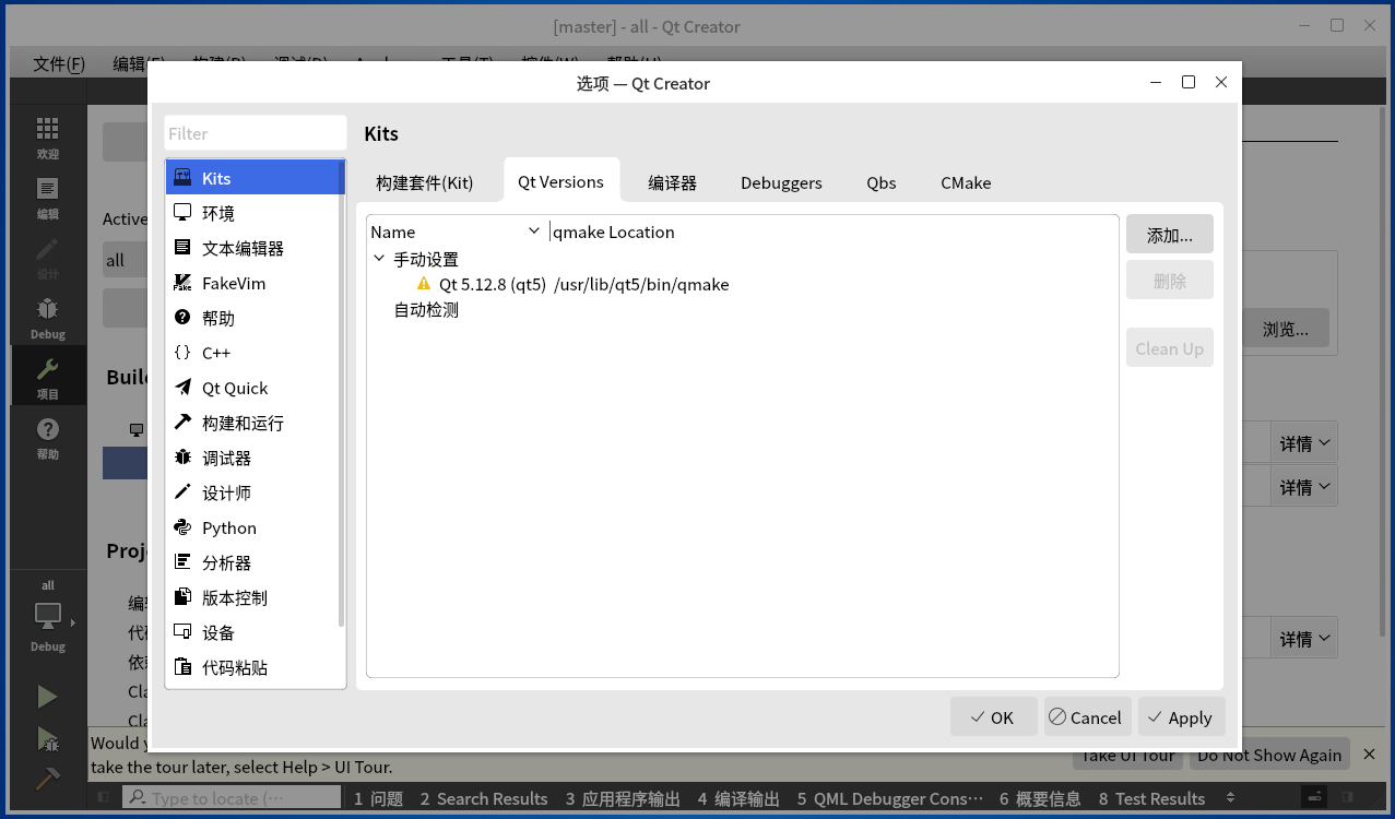 一般情况下,上边这一步都可以自动完成。如果 Kits 工具没有完成自动检测,可以手动设置一下。比如,Qt Qmake 的路径。