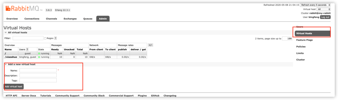 右边的Virtual Hosts就是创建库,Name就是库名,写的时候前面必须加/;
