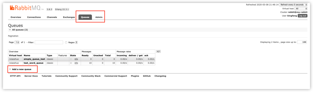 第一次接触的话,我们不要想着全部我一次性都看懂,都知道是干嘛的,我觉得没必要,先熟悉最基础的,我在上面圈了两个地方Queue、Admin和Add a new queue 这个三个是最基本的,我们学习必须要用的东西。