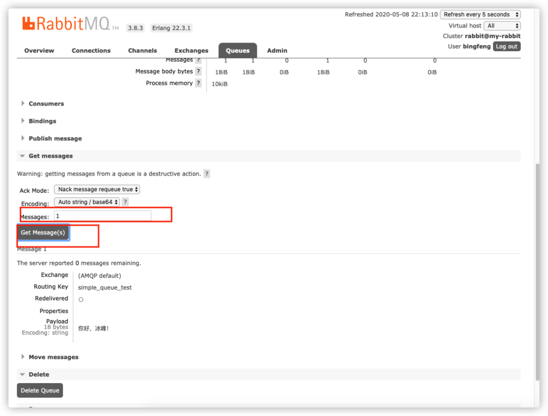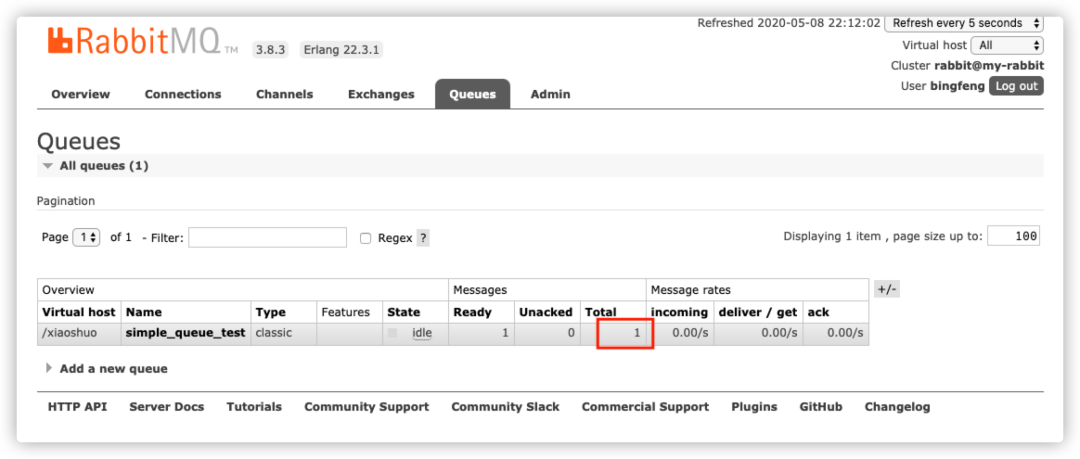 当我们发送一个消息之后,我们可以直接在面板看到队列中的消息数