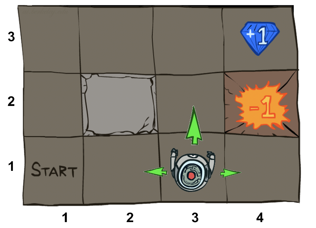 - 奖励函数R(s,a,s')。最大化报酬总额是任何代理的目标。此函数说明每个步骤可获得多少奖励。通常,为鼓励快速解决方案,每个步骤都会有少量的负奖励(成本),而在最终状态下会有较大的正面(成功的任务)或负面(失败的任务)奖励。例如下面的宝石和火坑。