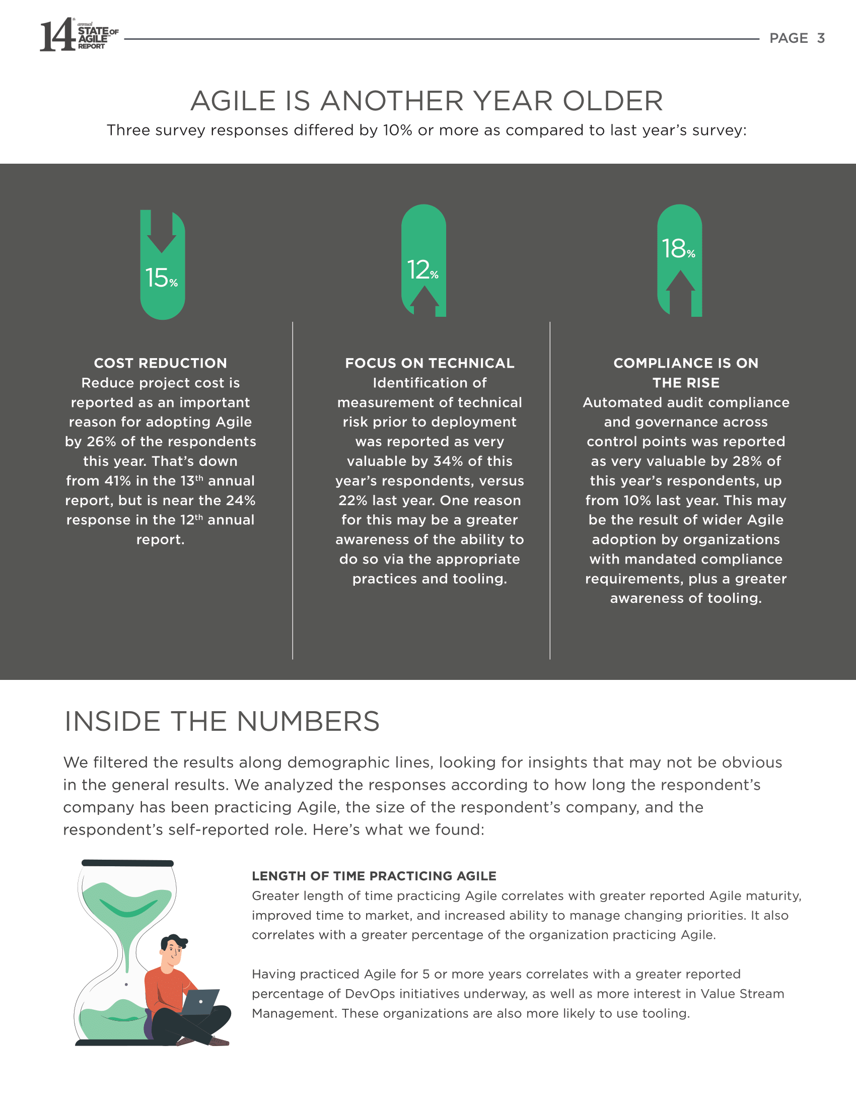 第14份年度敏捷状态报告基于全球1,100名IT和业务专业人员的经验。自成立以来,全球40,000名敏捷高管、从业人员和顾问分享了他们的见解,使敏捷状态报告成为同类报告中规模最大、运行时间最长的报告。继续阅读今年研究的一些关键发现。