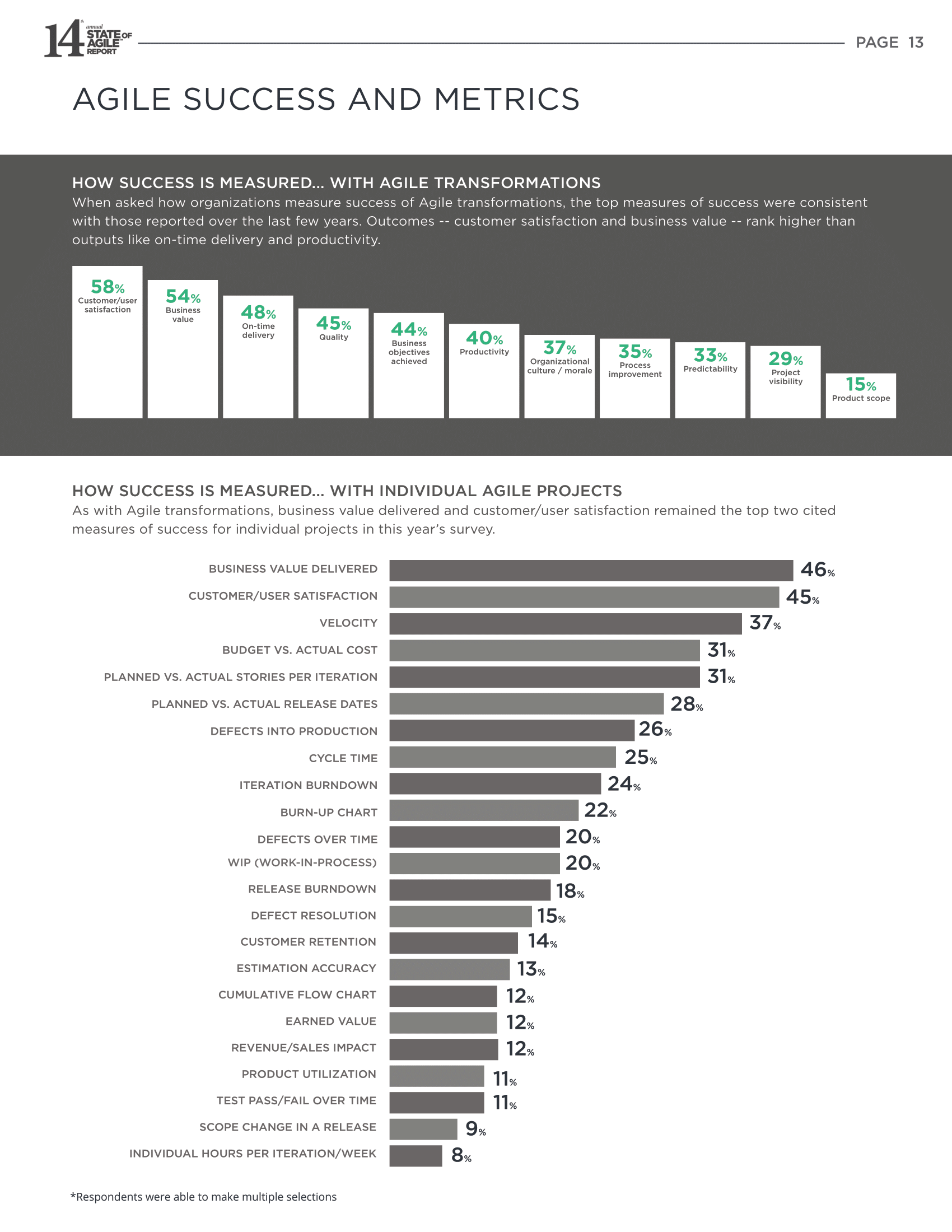 与敏捷转型一样,在今年的调查中,业务价值交付和客户/用户满意度仍然是单个项目成功引用的前两个指标。