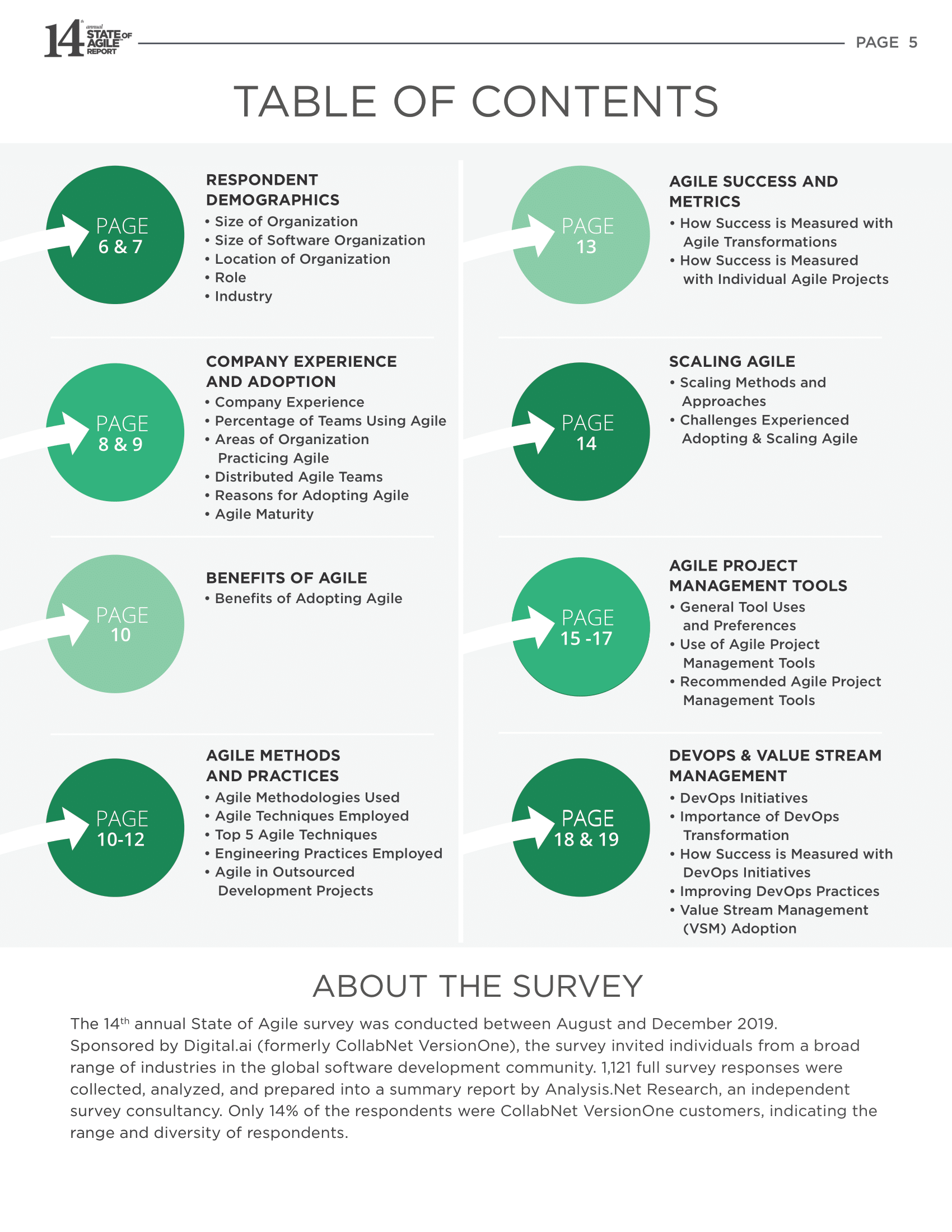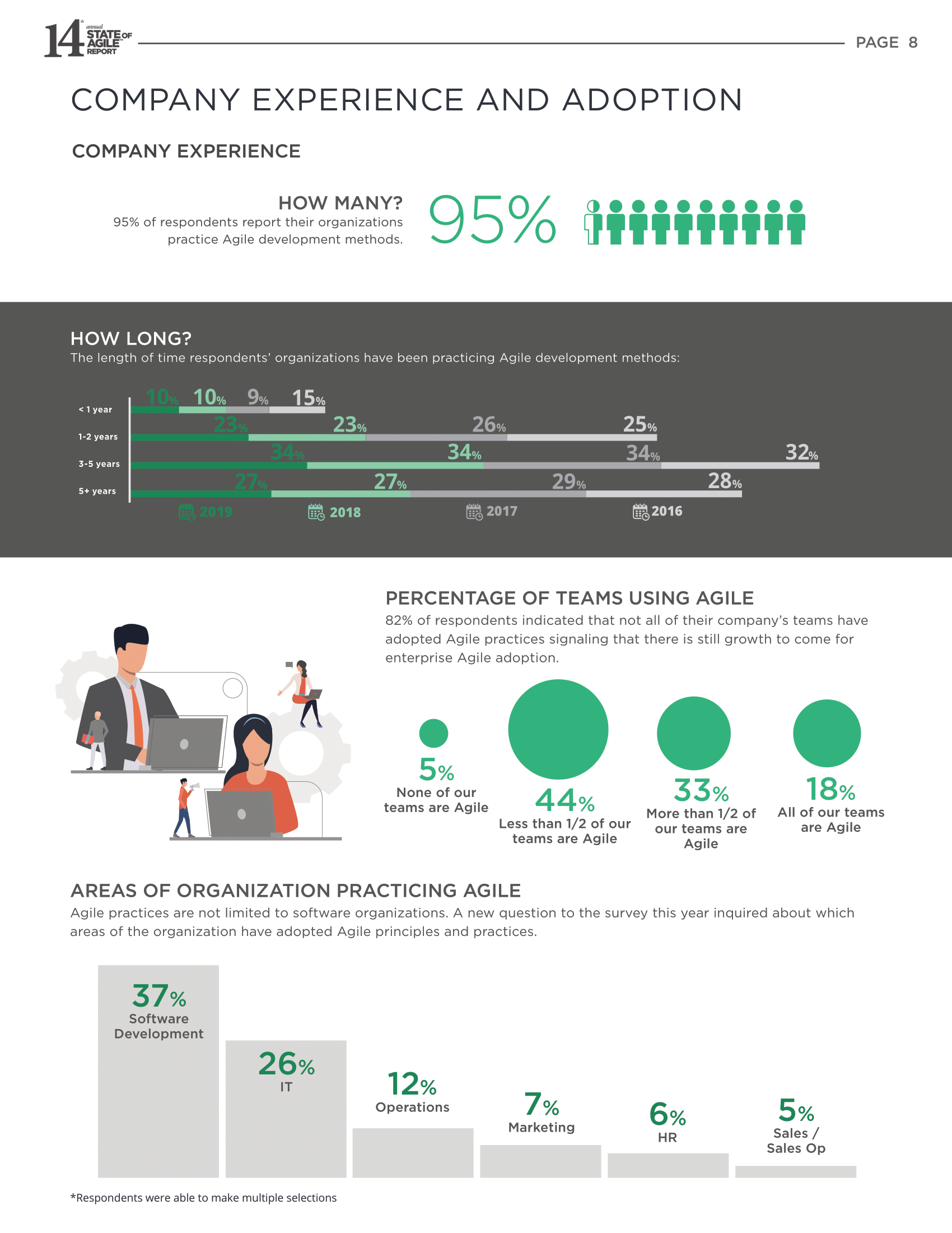 超过40,000名敏捷高管、从业人员和顾问参加了敏捷状态报告自成立以来的调查。(14年的总调查人数) 第14届年度敏捷状态调查提供了有关敏捷在企业不同领域中的应用以及价值流管理的见解。 查看结果时,您可能会发现一些熟悉的趋势,并发现上一年的调查中有一些值得注意的变化。 阅读并深入了解数字,以发现一些有趣的关联。