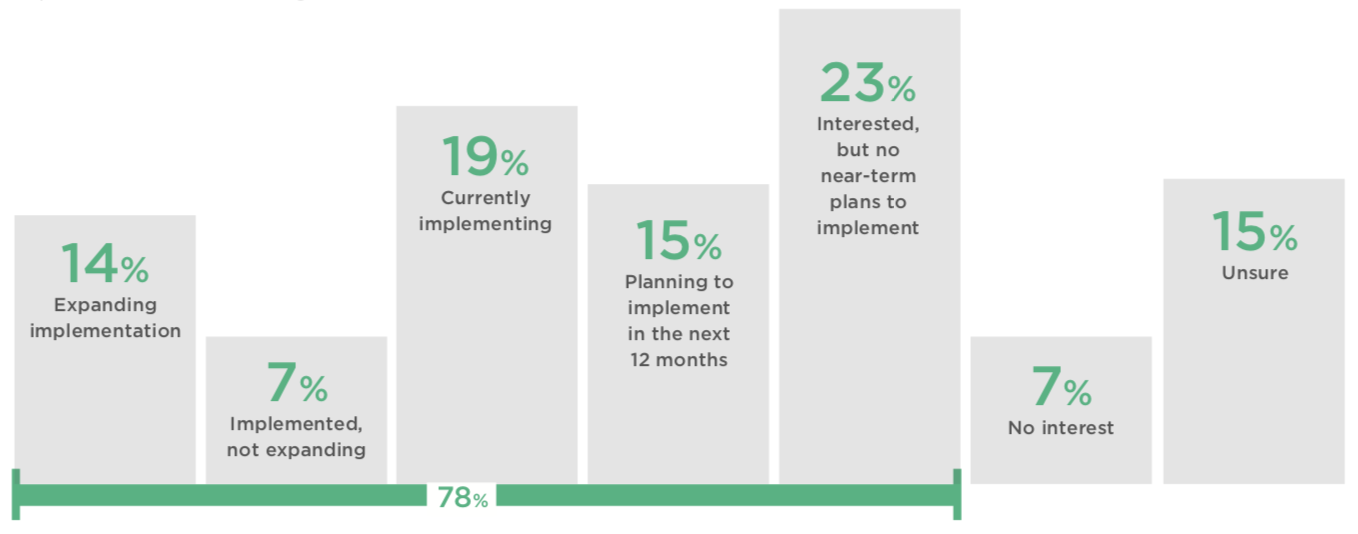 价值流管理(VSM)是人员、流程和技术的组合,可通过从创意到企业软件交付的流动来映射、优化、可视化、度量和管理业务价值流(以史诗,故事,工作项的形式) 通过开发和生产。 78%的受访者表示,他们的组织对VSM感兴趣,正在计划实施VSM,或者目前处于VSM实施的某个阶段。
