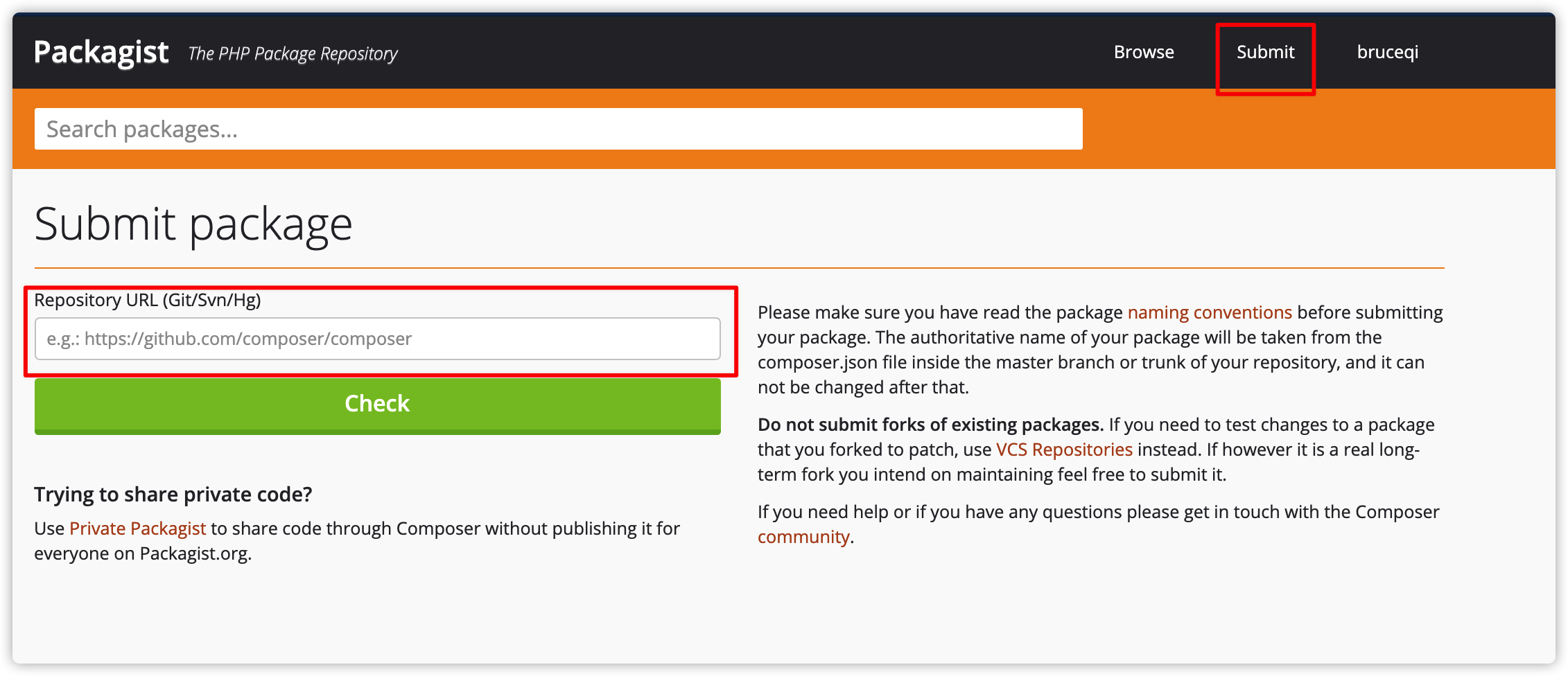 做好上面的配置之后,我们就可以将代码发布到packagist。首先我们需要将代码更新到GitHub仓库。登录packagist,然后点击右上角的submit按钮,在输入框中输入GitHub仓库地址即可。