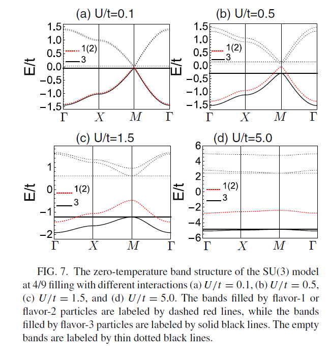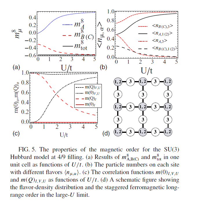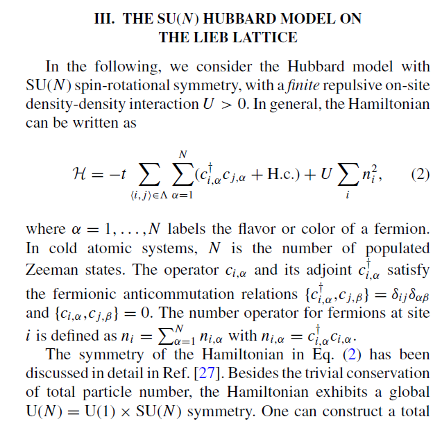 用SU(N)Hubbard研究了巡游铁磁的SU(N>2)推广模型[27,28]。文献[27]给出了一个充分条件为长冈国的一个推广提供了严格的证明。在文献[28]中,作者确定了顺磁到巡回铁磁态散射长度及其SU(N)推广平均场铁磁性的Stoner判据水平,发现它与SU(2)情况相同。作为长冈铁磁性[2]与平带铁磁性[3–7]在SU(2)系统中,可以认为满足SU(2)Stoner准则,我们期望广义SU(N)在满足例如,SU(N)Stoner准则填充平带,DOS在费米能级上发散。