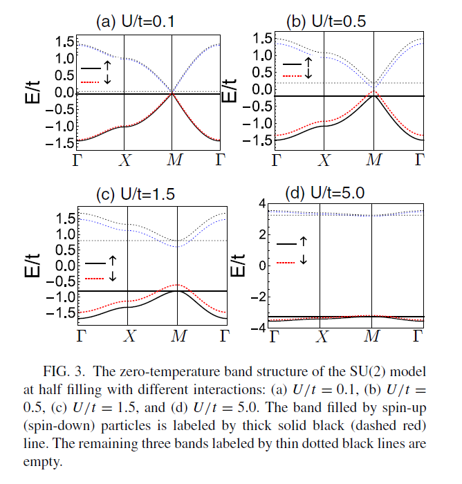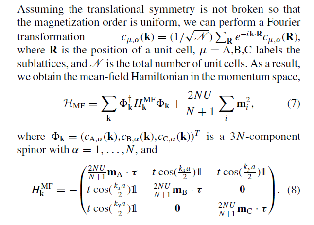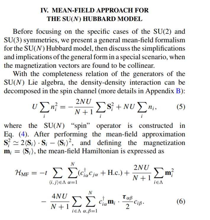 对于SU(N>2)对称有限方程(2)中的哈密顿量互动U,据我们所知。为苏(3)哈伯德吸引相互作用U<0的模型,自旋反射正性[Lieb证明SU(2)的方法]哈伯德模型]可以在马约拉纳的帮助下扩展费米子[40,41]。然而,对于排斥相互作用U>0,这样的扩展就成了问题。因此,我们使用用Hartree-Fock平均场近似研究磁场含SU(2)和SU(3)的Hubbard模型的性质对称性。