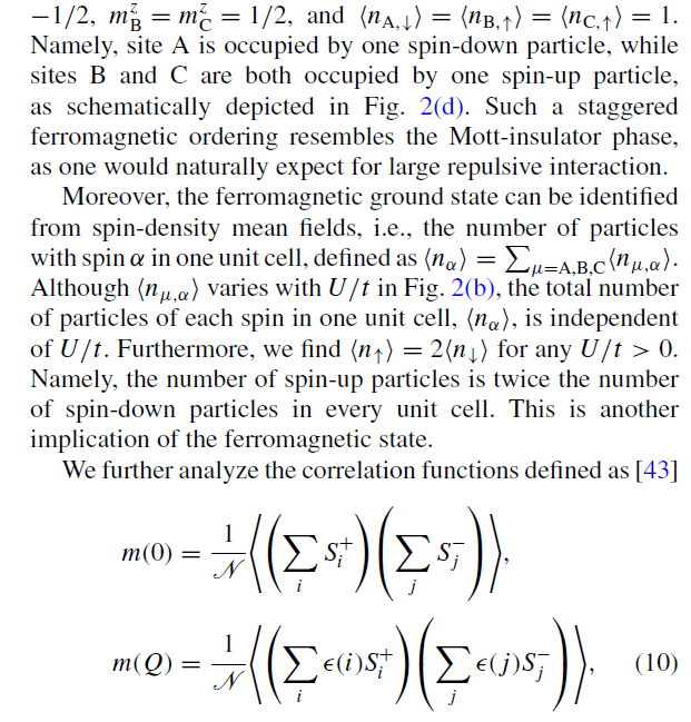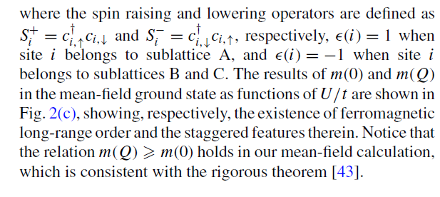 对于SU(2)对称的情况,Lieb已被严格证明半填充时,式(2)的基态是唯一的[除了平凡的(2S+1)-折简并]和自旋S=N/2,其中N是单位细胞的数目[7]。严格地说,它是一个铁磁状态,因为自旋不饱和。用Lieb的术语来说,铁磁性意味着总自旋不为零并且与系统成比例大小。在下面的讨论中,我们采用相同的定义也不要区分铁磁性和铁磁性。