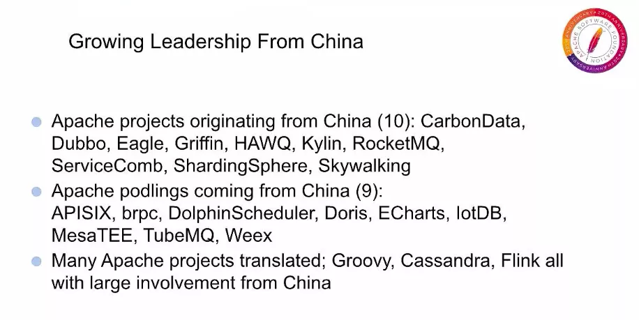 令人兴奋的是,中国的技术专家和公司如此迅速地采用全球开源技术,现在不仅帮助 Apache 建立新项目,而且改善开源本身的工作方式。 来自中国的整个 Apache 新项目的发展也令人印象深刻,我们目前有 10 个源于中国的顶级项目,其中几个项目非常有名,现在还有 9 个来自中国的 Apache 孵化器项目正在努力成为顶级项目。