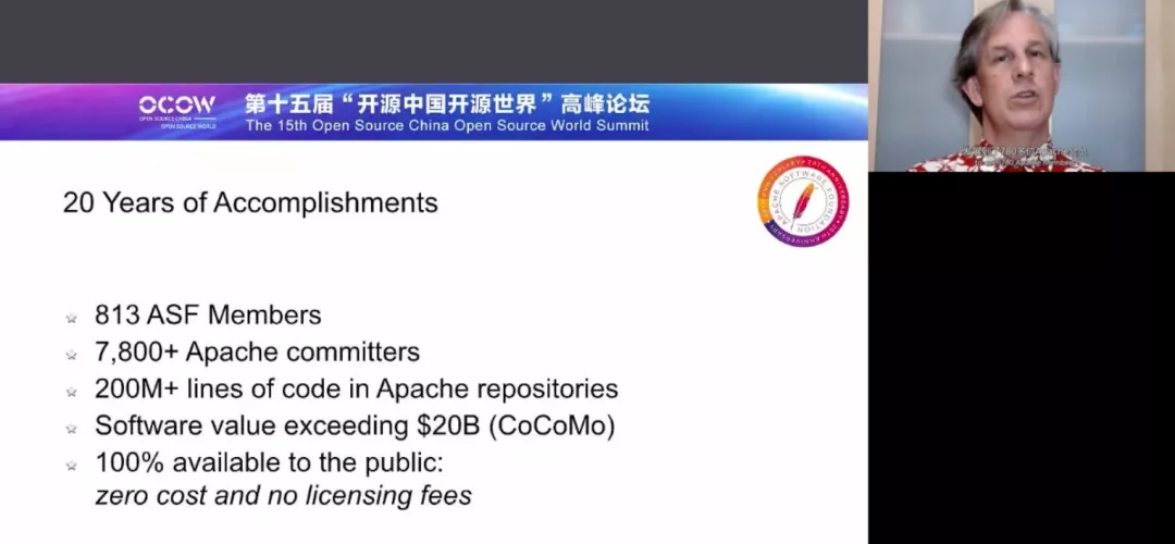 7 月 15 日,由中国开源软件推进联盟(COPU)主办,赛迪传媒、《软件和集成电路》杂志社联合承办,CSDN 独家直播的 2020 第十五届“开源中国开源世界”高峰论坛在线上盛大召开。Apache 基金会副主席 Shane Curcuru 发表《The Apache Software Foundation: Community-Driven Global Innovation》主题演讲,深入分享了 Apache 的治理之道,以及 Apache 项目社区在中国的发展现状。