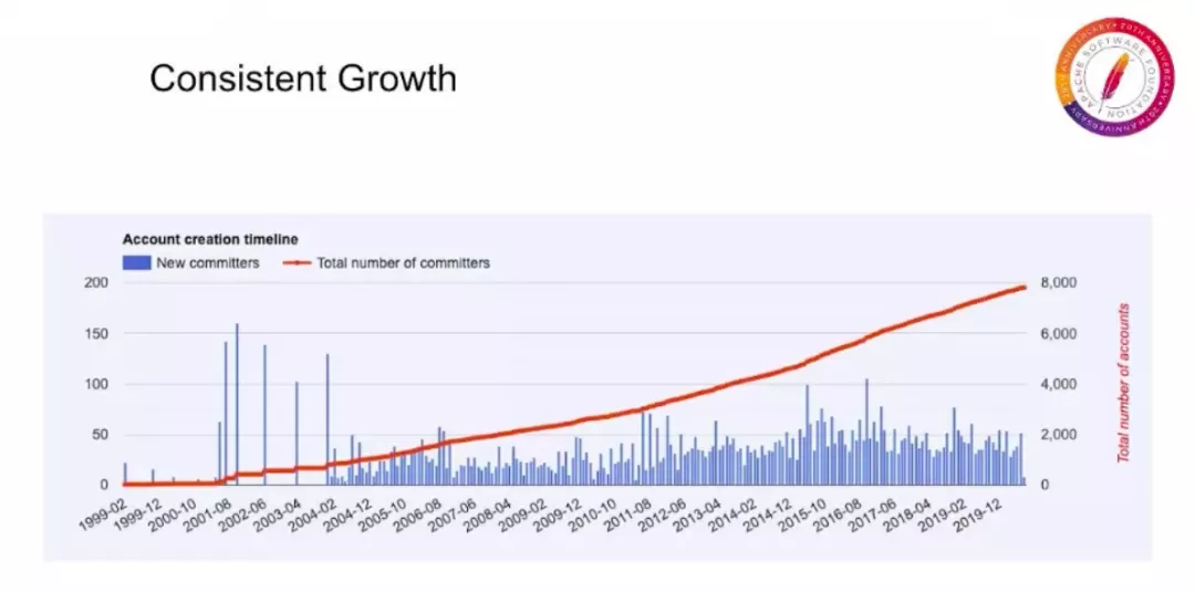 在过去的 20 年里,提交者(Committers)数量稳步增长,现已有近 8000 名提交者,这些 Apache 项目中的提交者已经发布了超过 2 亿行代码,总价值远超 200 亿美元。