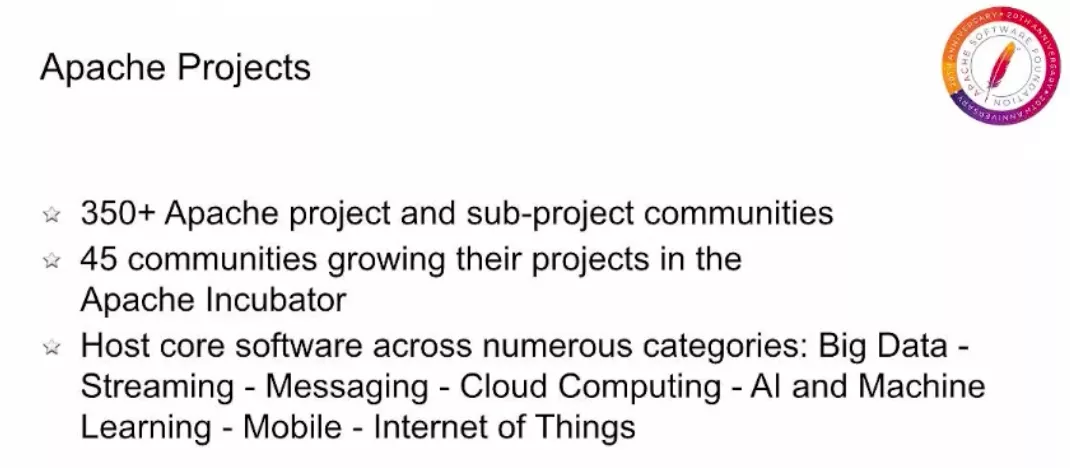 重要的是这些 Apache 项目涵盖了从大数据、流媒体到物联网,再到所有涉及云管理的技术领域。至于其他 Apache 项目,期待您的贡献。现在越来越多的 Apache 项目正在致力于提供网站翻译或中文邮件列表,这样用户不仅能够更容易地理解软件,还能够加入我们的项目。