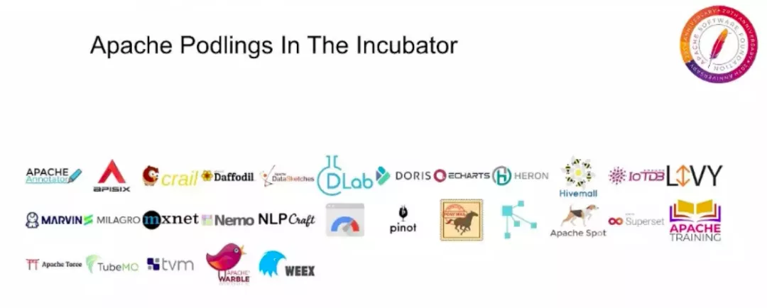 另外,目前 Apache 孵化器中有 45 个新社区(称为项目),这些孵化器项目是 Apache 指导下的整个项目社区,旨在将其社区发展成为一个可持续的自治团队。